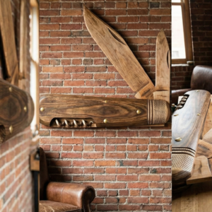 The ultimate tool for your wall. This massive, handcrafted wooden sculpture reimagines the classic red pocket knife as a rustic masterpiece. Featuring two extended blades and a fully 3D carved corkscrew, this piece captures the spirit of adventure and preparedness on a grand scale. Built from stained hardwoods with brass-toned accents and realistic knurled details, it’s the perfect centerpiece for a cabin, workshop, or man cave.